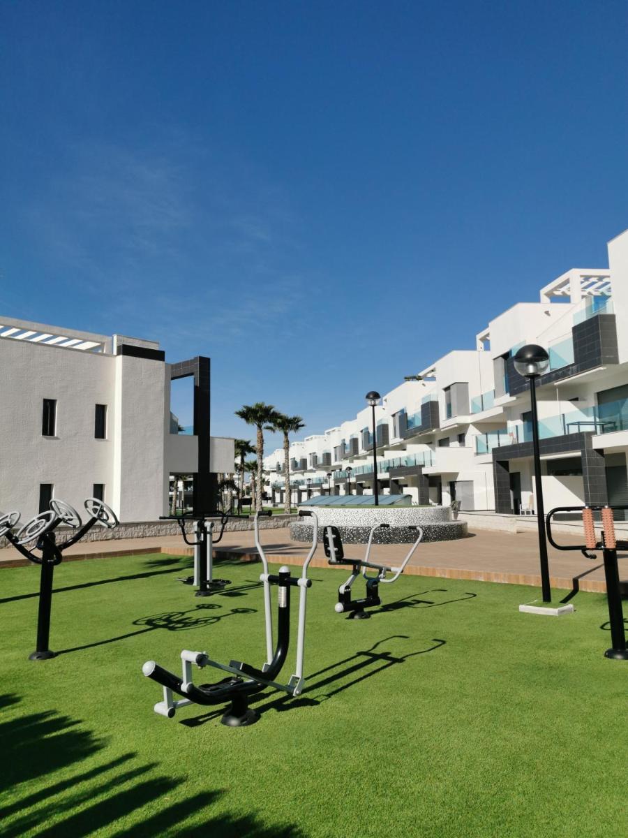 The property’s outdoor spaces provide breathtaking views of both the terrace and pool area, enhancing relaxation and enjoyment. Ideal for families, the apartment includes a children’s playground and outdoor furniture, making it ideal for entertaining young visitors. Guests can explore nearby attractions such as the Oasis Beach Juán, where they can enjoy the infinity pool and lush gardens, or visit the Santa Pola Salt Museum, which is approximately 15 miles away.