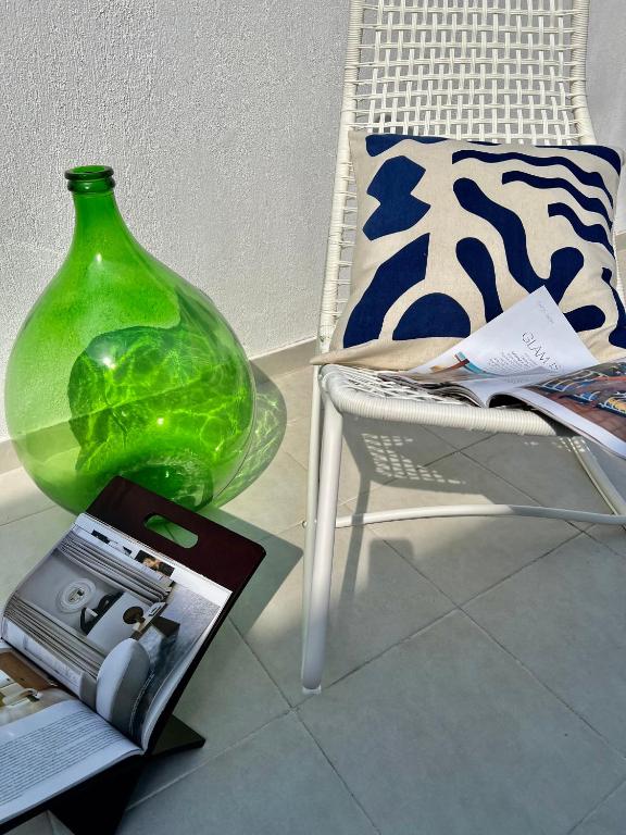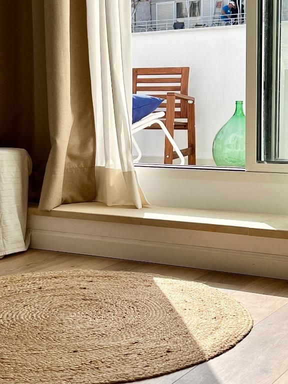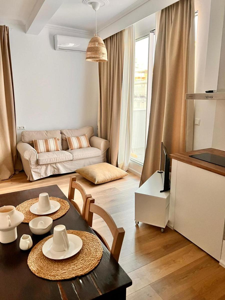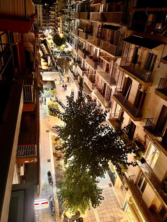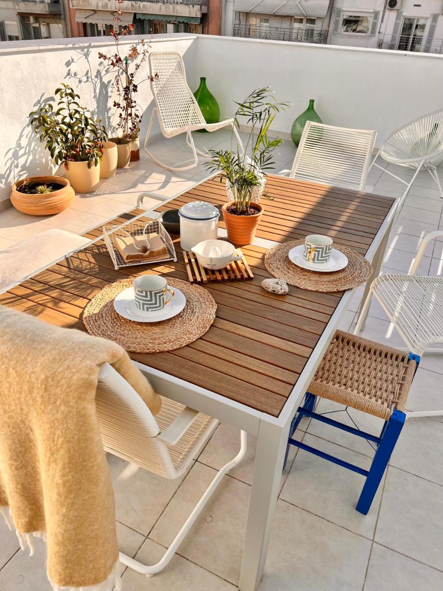 The balcony is sparse and sunny, you look at the beautiful streets of Thessaloniki. All the landmarks are close, shops and city...
