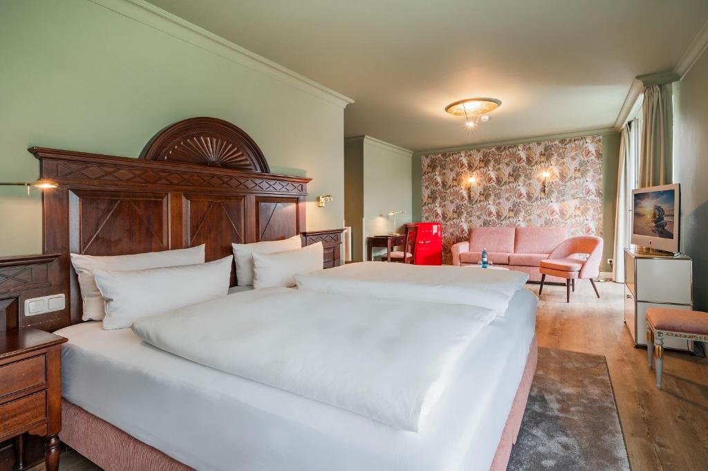 Guests can choose between standard rooms, family rooms, and suites at the Strandhotel Heringsdorf.