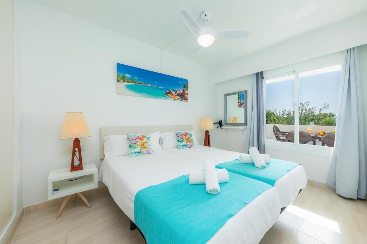 Equipped with modern amenities, the apartment includes an outdoor swimming pool with a security fence and complimentary Wi-Fi, enhancing the overall experience. Guests will appreciate the private entrance, providing enhanced privacy during their visit. The air-conditioned living quarters feature two bedrooms, offering ample space for families or groups of friends. A terrace with garden views adds a touch of tranquility, making it perfect for unwinding after a long day at the beach.