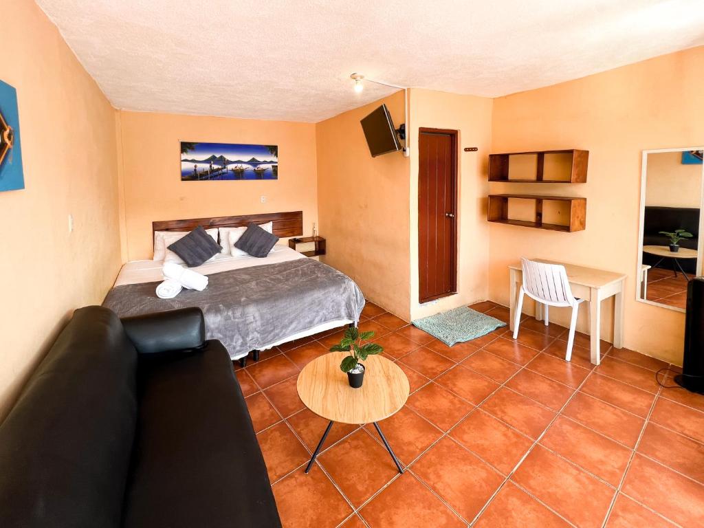 Amigos offers guests an authentic experience near San Pedro La Laguna, featuring lush gardens and panoramic mountain views overlooking Atitlán Volcano. This charming accommodation boasts a 24/7 front desk, convenient airport transfers, and a fully equipped shared kitchen where guests can prepare meals together. Free Wi-Fi ensures connectivity throughout their stay. Each room at Amigos features a private balcony offering breathtaking lake vistas, making it perfect for enjoying the scenic surroundings.