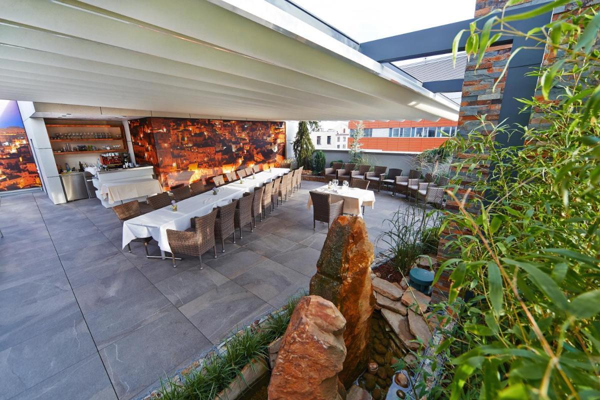The terrace offers stunning views and ample outdoor seating.