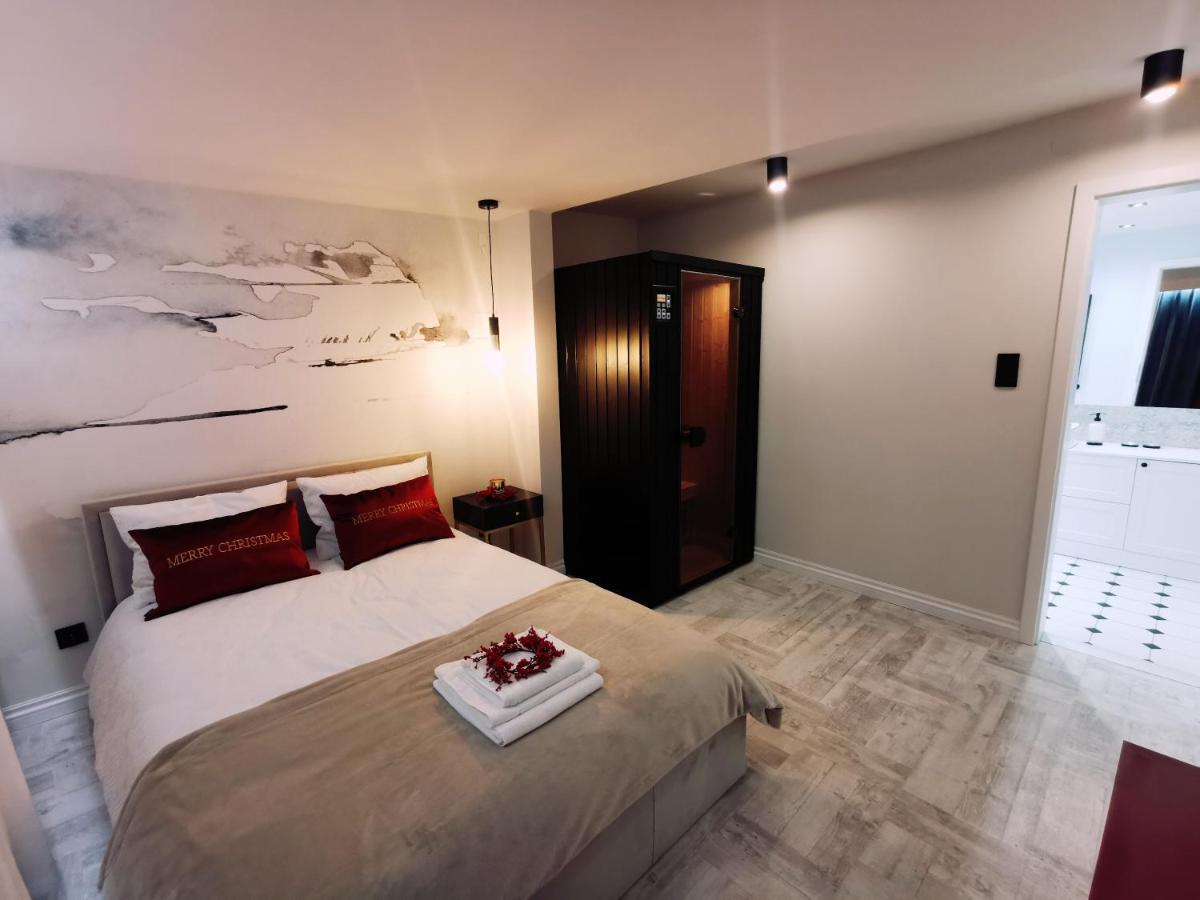 The apartment offers luxurious experiences such as a sauna and fireplace.
