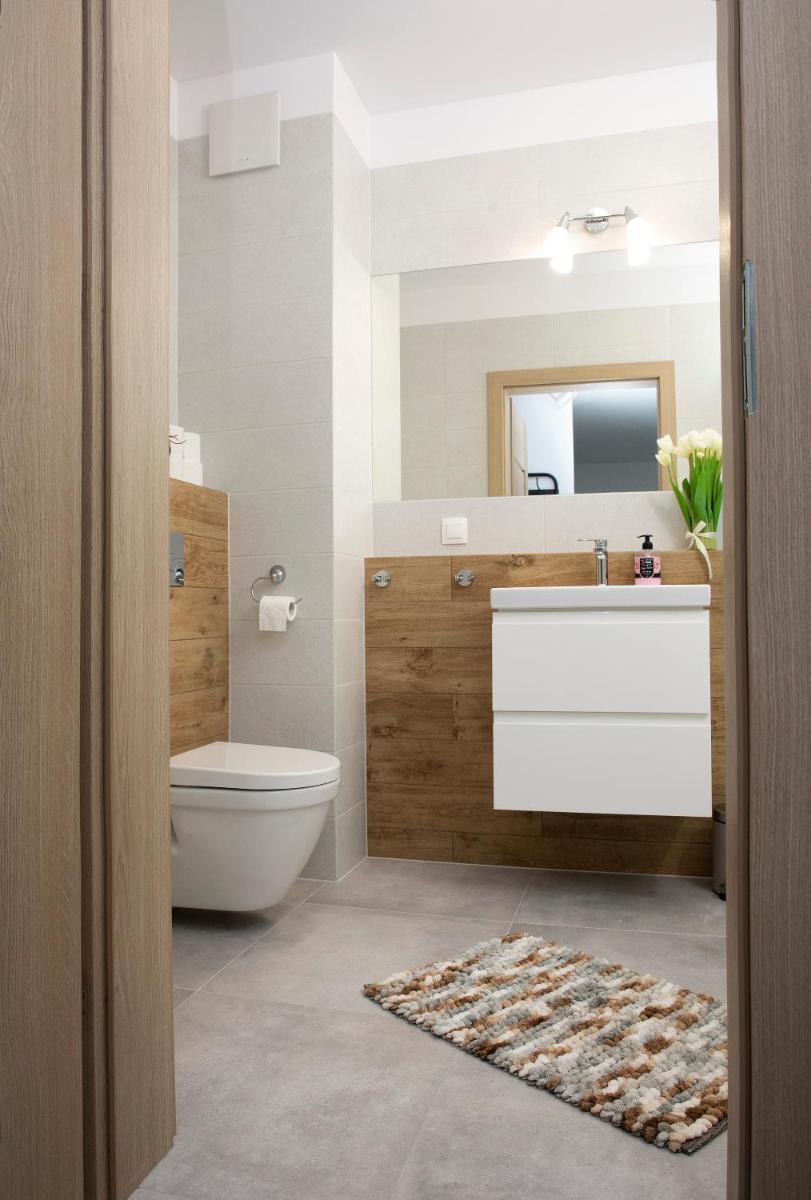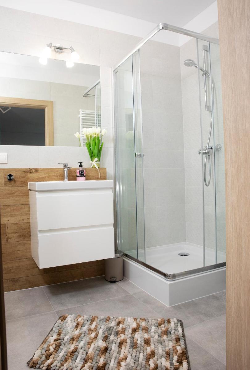 The 'Róża' apartment offers free Wi-Fi, complimentary private parking, a fully functional kitchenette including a dishwasher, an oven, and a microwave, a private bathroom with a hairdryer, a terrace, and an elevator.