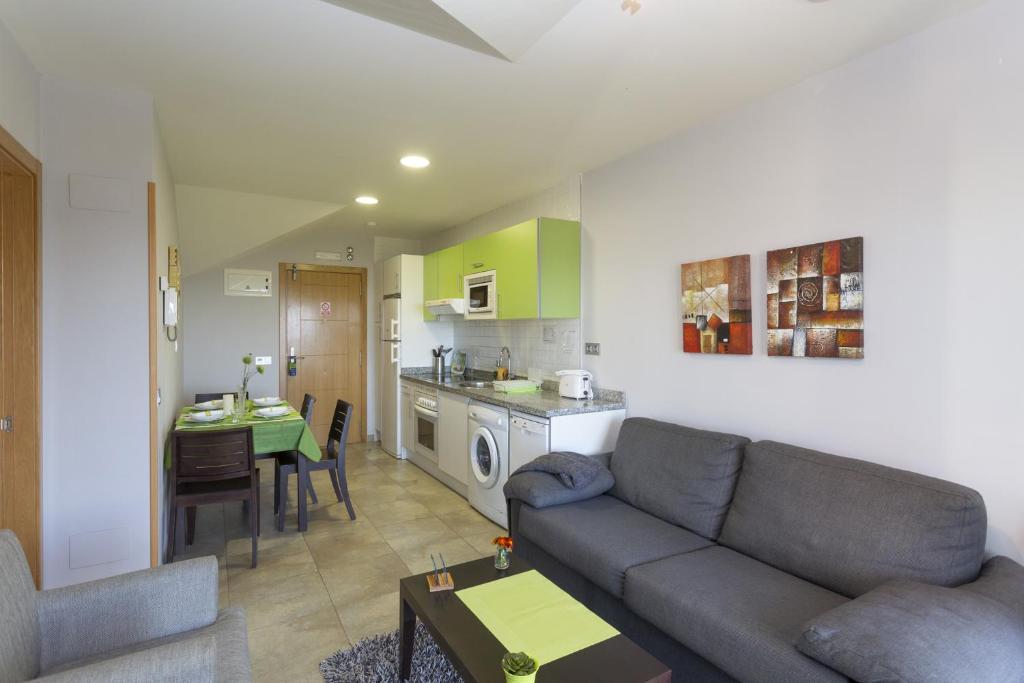 The apartment complex offers a state-of-the-art gym, free Wi-Fi, a private furnished terrace, and a spacious living room equipped with a sofa bed, flat-screen satellite TV, and DVD player.