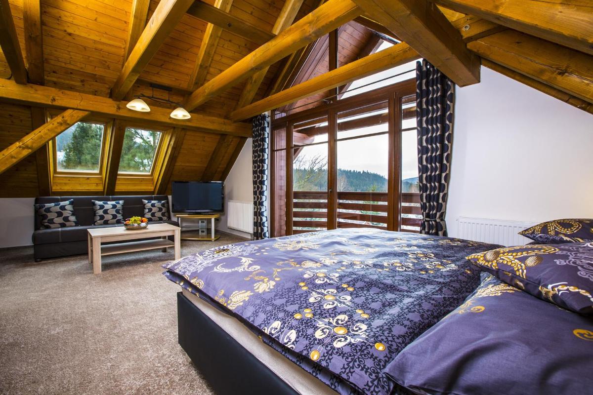 Apartmány Slunce in Harrachov offers comfortable accommodations featuring a garden and terrace, offering guests ample space and relaxation opportunities. With free private parking and a tour desk, guests can easily explore the surrounding area at their leisure. Each unit includes a private entrance, ensuring privacy and comfort during stays. The apartments come equipped with a seating area, a dining area, and a fully-equipped kitchen with essential appliances such as a dishwasher, microwave, toaster, and fridge. Guests enjoy a variety of cooking facilities, making meal preparation convenient. Private bathrooms, free Wi-Fi, and bed linens and towels are also provided to enhance the guest experience. A balcony option adds an extra touch of charm, allowing guests to enjoy scenic views. Some rooms offer mountain views, providing a serene backdrop. For those seeking additional activities, ski storage space is conveniently located onsite, ensuring easy access to winter sports. Both skiing and cycling are accessible within a short distance, making it ideal for outdoor enthusiasts. Conveniently situated near Harrachov's airport, the accommodation offers easy travel options. Nearby attractions include museums, waterfalls, and cultural sites, enriching the stay with diverse experiences.