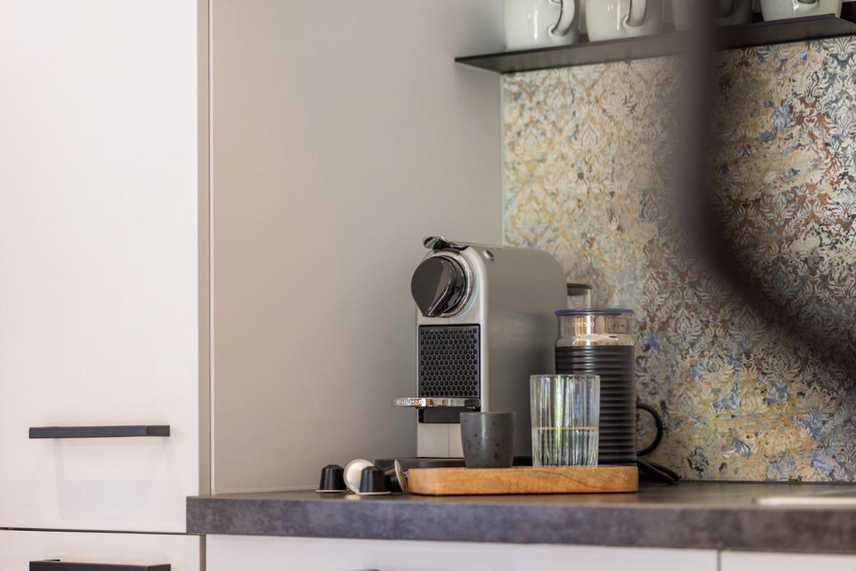 The apartment includes free Wi-Fi, a cozy fireplace, a balcony, and an outdoor dining area with barbecue facilities.
