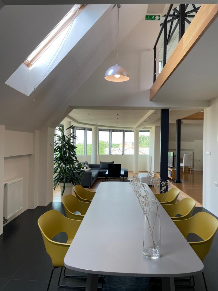 Apartment Penthouse Festina Lente in Sombor offers luxurious accommodations featuring a garden, a bar, and a shared lounge. This 4-star apartment includes an elevator, a shared kitchen, and amenities such as air conditioning, free private parking, and Wi-Fi. Units boast parquet floors, fully equipped kitchens, and offer terraces with city views. Guests enjoy access to a packed lunch service and various tour options nearby.