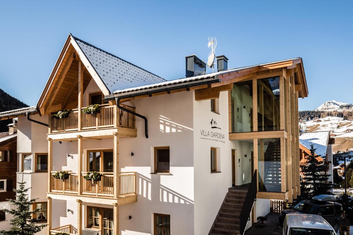 Apartment Villa Gardena - Gardenahotels in Selva di Val Gardena, nestled amidst verdant gardens overlooking the scenic landscape, promises a tranquil retreat with its array of amenities. Offering panoramic city views, this luxurious villa combines modern comfort with traditional elegance, providing guests with everything necessary for a memorable stay. Nestled within the picturesque setting of Selva di Val Gardena, the property seamlessly blends into the natural beauty around it, ensuring a seamless blend of urban conveniences and rural tranquility.
