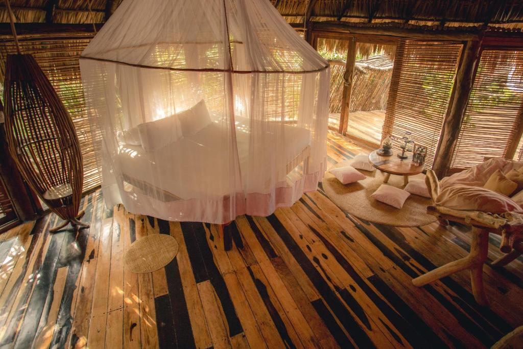 Azulik, a luxurious 5-star hotel nestled in the heart of Tulum, provides an unparalleled stay just minutes away from the serene shores of South Tulum Beach. Offering a prime spot along the coast, this establishment boasts a private beach area where guests can unwind by the water's edge. Free private parking ensures easy access, and the hotel features a spacious terrace offering breathtaking views of the surrounding landscape. Dining enthusiasts will delight in the inviting ambiance of the restaurant, which serves up delicious cuisine in a warm atmosphere.