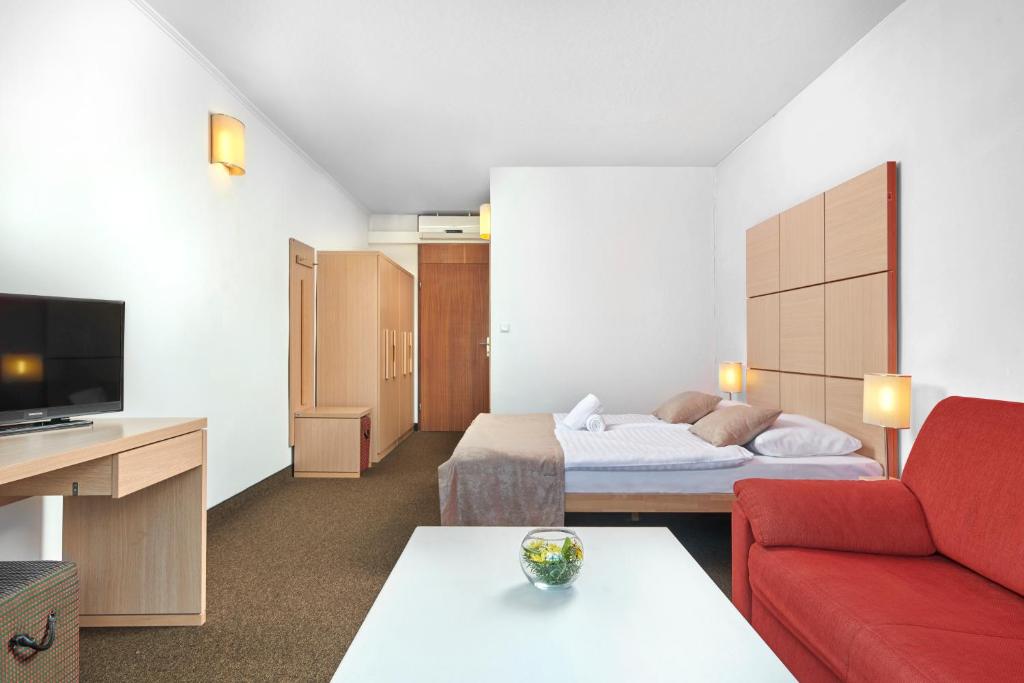 The Aminess Magal Hotel, nestled within a scenic oak forest near the picturesque fishing village of Njivice, offers a serene coastal retreat just 492 feet from the shimmering sea. This comfortable accommodation features spacious rooms equipped with essential amenities, ideal for family vacations. Enjoy panoramic views from the beachside terrace while savoring the complimentary buffet breakfast and exquisite dinner options featuring unlimited wines, beers, juices, and waters. Relish the tranquility in the well-stocked TV lobby bar or indulge in luxurious treatments at the beauty salon. Children will have fun with sports activities and entertainment programs. Conveniently located between Malinska and Krk, this charming hotel provides easy access to various attractions and leisure opportunities.
