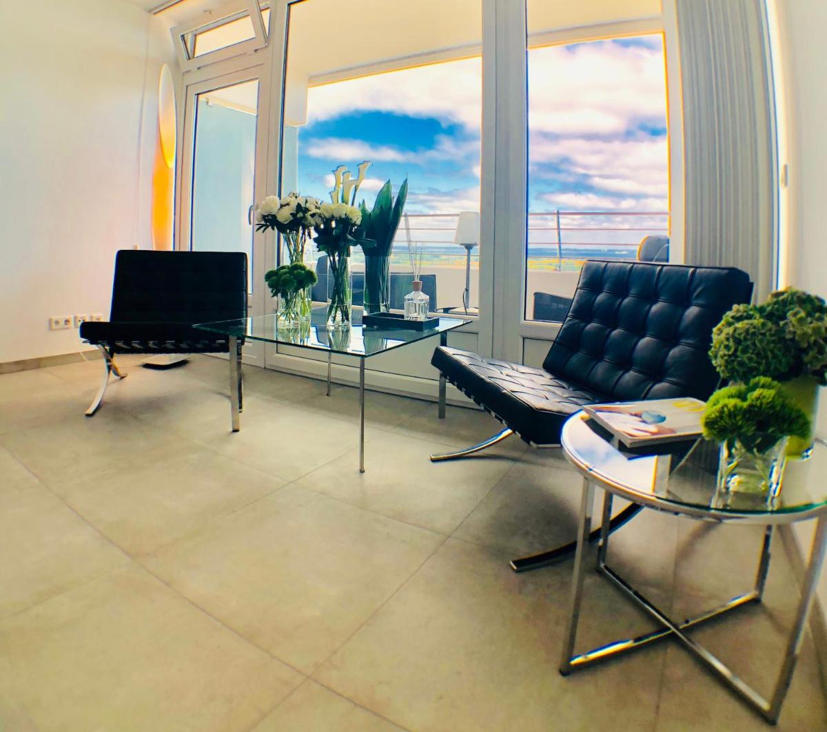 The view from the 31st floor of the Travemünde Beach is stunning. There are 2 very comfortable chairs on the balcony to soak this up.