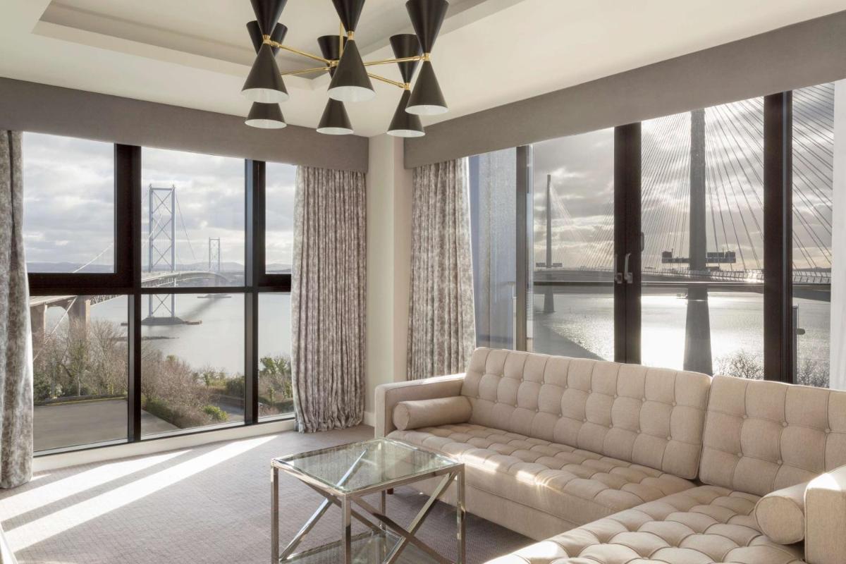 DoubleTree by Hilton Edinburgh - Queensferry Crossing boasts expansive panoramas over the Firth of Forth, offering spacious accommodations equipped with complimentary Wi-Fi and an inviting bar. Modern rooms featuring LED TVs, tea/coffee facilities, mini-fridges, and workstations provide a comfortable stay. The hotel's prime location near the Forth Rail Bridge, Forth Road Bridge, and Queensferry Crossing offers breathtaking vistas and convenient access to Edinburgh City Center and nearby attractions such as Aberdour Heritage Centre and Andrew Carnegie Birthplace Museum. The SeaView Suite includes a balcony and bathtub, ensuring a memorable stay amidst picturesque surroundings.