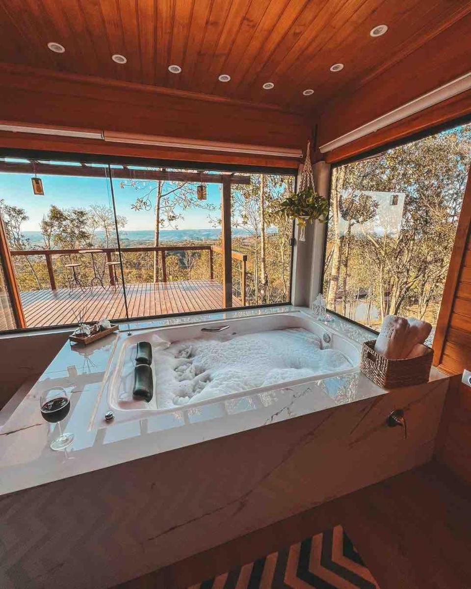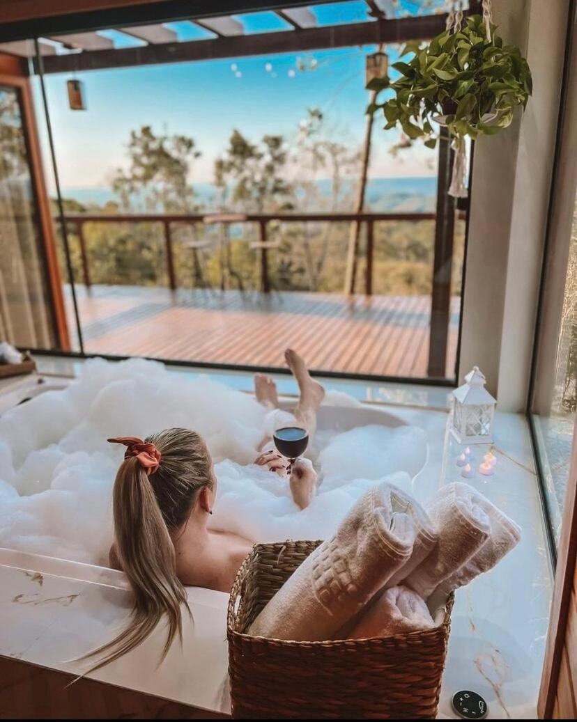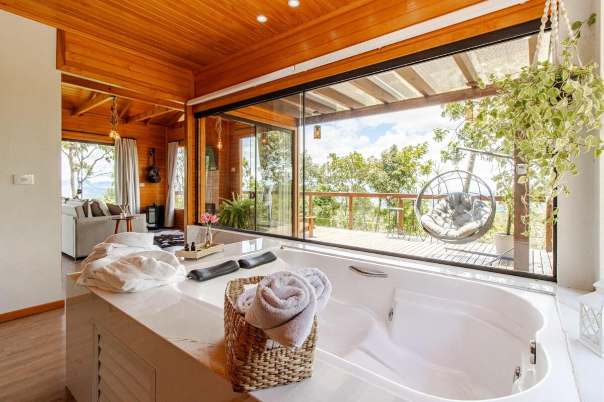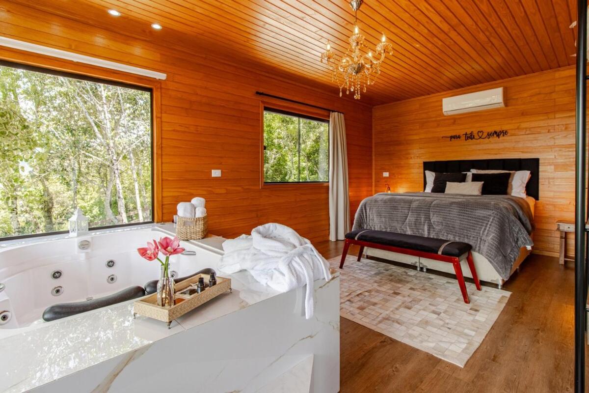 The Chalet at Bom Retiro offers free WiFi, free parking, non-smoking rooms, a private balcony, a hot tub, a fully equipped kitchen, a spacious living area, air conditioning, shower, and a spa bath.