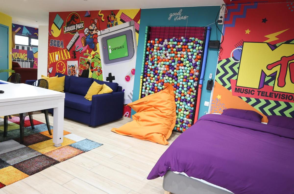 The Capsule 90's - Jacuzzi - Sauna - Flipper - Billard - Netflix - Nintendo Switch & Jeux offers luxurious accommodations nestled 23 miles from Valenciennes Train Station in Mons. This charming 1-bedroom apartment boasts modern amenities, including a dining area, flat-screen TV, gaming console, fully-equipped kitchen, and comfortable bedding. Guests enjoy access to a sauna and hot tub, along with complimentary Wi-Fi and a private garage. The spacious balcony offers scenic views, perfect for relaxing after a day exploring the local attractions. Near by, visitors can find attractions such as Le Phenix Performance Hall within 21 miles and the Fine Arts museum located just 23 miles away. For those interested in sports, they may wish to visit Musseums like MAC's, Mundaneum, Maison Van Gogh, Artothèque, Centre d'innovation et de design, Maison Van Gogh, Rétrotrain, SparkOH!, Machine à Eau, Mons Memorial Museum, and Musee du Doudou. Parks nearby include Parc Zoologique, offering an opportunity to immerse oneself in nature. The property also features a cozy bathtub, ensuring relaxation before bedtime. Overall, this air-conditioned apartment provides a perfect blend of comfort, convenience, and entertainment, making it an ideal choice for travelers seeking a memorable stay in Mons.