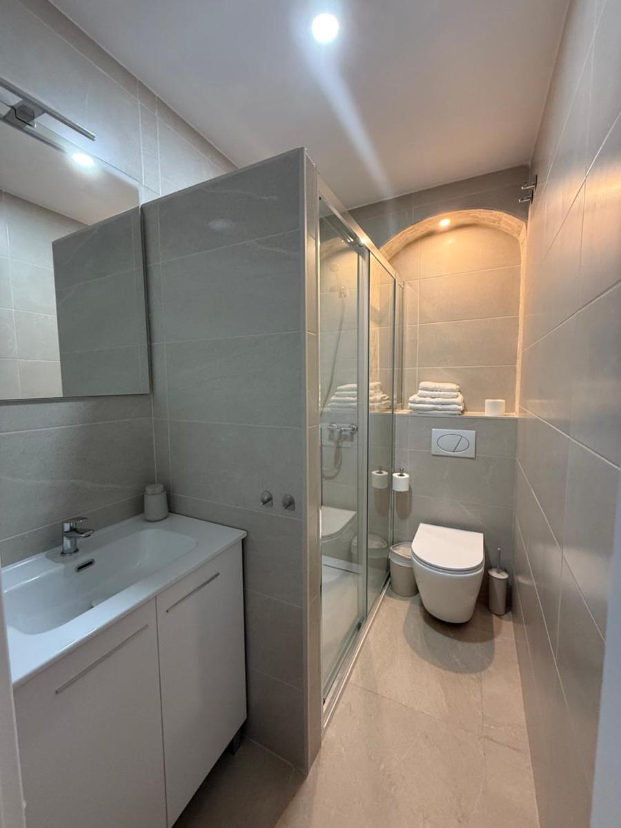 The apartment offers a quiet location with a private balcony overlooking a small plaza.