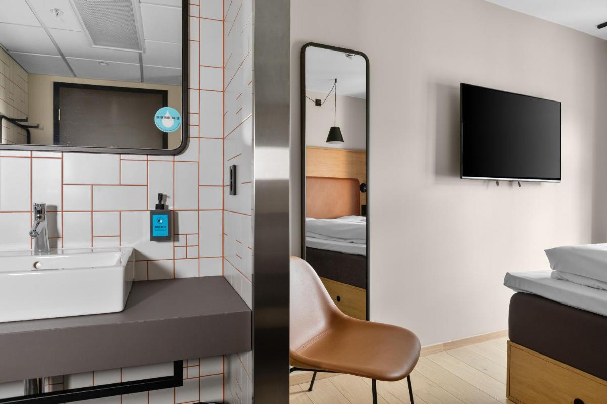 This is a hotel with smart solutions for those who don't want to waste their money on unnecessary fuss. This means that there are no expensive services like room service or a minibar in the room. Instead, you'll find loads of snacks, food and drink in our lobby shop open 24/7. We also do our best to reduce the impact on the environment; you'll notice this when you get here. That's why we've done away with the hotel restaurant and why we don't wash towels and bedding every day.