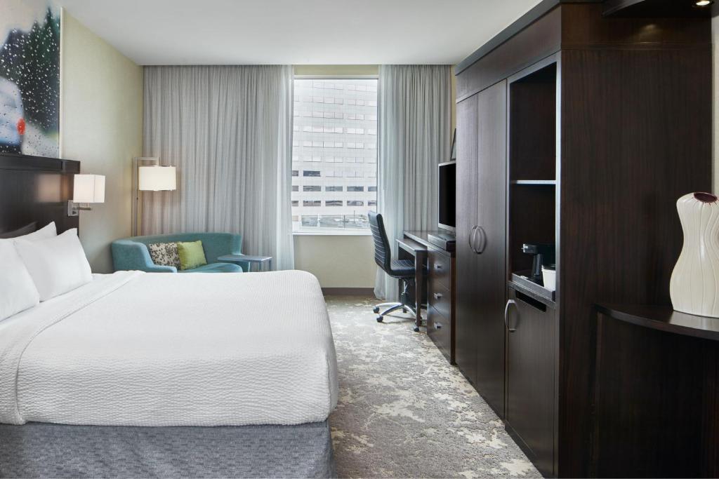The Courtyard Portland City Center is situated centrally in downtown Portland, ideally placed near the scenic Willamette River and just a brisk 15-minute stroll to PGE Park. This modern hotel boasts a well-equipped gym and a standard configuration of 43-inch LCD TVs in every room, ensuring guests have access to their favorite streaming services. Each guest suite is adorned with contemporary decor, featuring large pieces of art, making the stay both visually stimulating and comfortable.