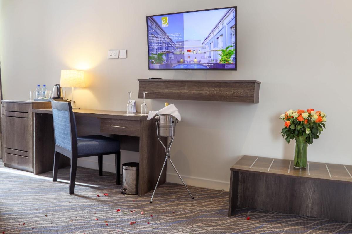 Eka Hotel Eldoret, situated 12 miles from Leseru Station, provides 4-star accommodations in Eldoret, Kenya. This inviting establishment features a 24/7 front desk, airport shuttle services, and complimentary Wi-Fi access across its premises. Guests enjoy amenities such as a fitness center, a terrace offering scenic views, and a bar where they can unwind. Air-conditioned rooms come equipped with essential items like desks, electric teapots, minibars, safes, flat-screen TVs, and private bathrooms featuring showers.