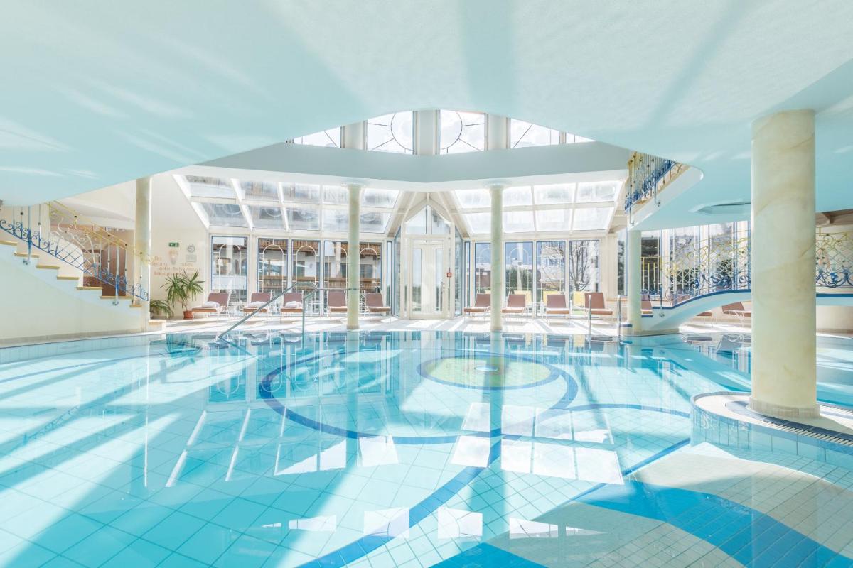 The spa's centerpiece is its panoramic outdoor pool, which promises refreshing moments amidst stunning mountain vistas. For those seeking culinary delights, Hotel Neue Post boasts an à la carte restaurant offering both contemporary and classic fare, complete with a terrace where diners can enjoy their meals al fresco under the watchful gaze of nature. Rooms here feature balconies offering breathtaking views of the surrounding landscape, ensuring guests never lose sight of their surroundings during their stay.