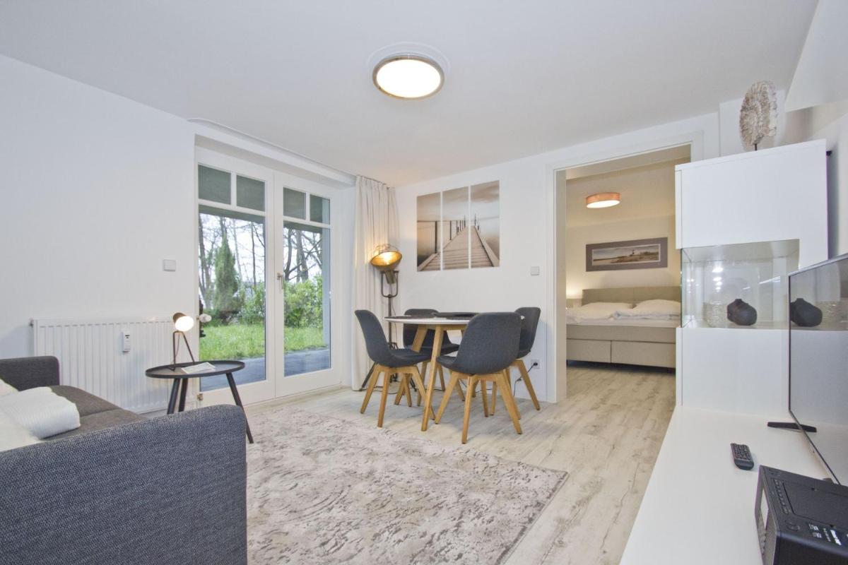 Maxim: A 2-minute stroll from Lietzow Beach leads to modern Ferienwohnung "Ferienresidenz Zwei Bodden 112" - a charming accommodation offering easy access to a sauna. Enjoy a peaceful retreat with its own terrace and free private parking. Located just 3.9 miles from the bustling Störtebeker Festival and 21 miles from Cape Arkona, this cozy home offers a perfect getaway.
