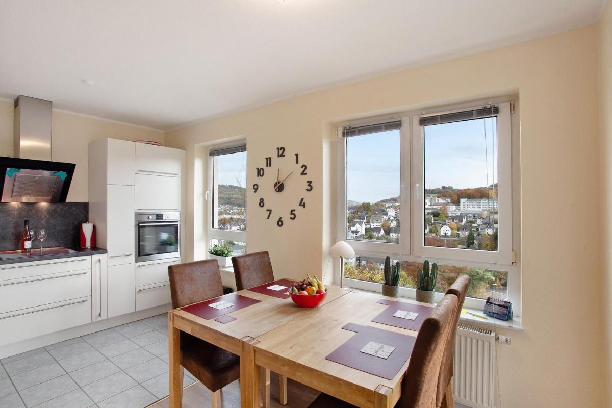 Fewo am Hennesee, situated in Meschede approximately 31 kilometers from St.-Georg-Schanze and 43 kilometers from Mühlenkopfschanze, offers guests a tranquil stay with its quiet street views. This cozy apartment boasts two bedrooms, one bathroom, bed linens, towels, a TV with streaming services, a fully equipped kitchen, and a balcony offering panoramic city views. For added privacy, the property has a private entrance. Guests can explore various activities within the vicinity, such as cycling and hiking. Located just 37 kilometers from Olsberg Concert Hall, 20 kilometers from Trapper Slider, and 40 kilometers from Postwiese Ski Lift, Fewo am Hennesee provides easy access to numerous recreational opportunities. The nearest airport is Paderborn-Lippstadt Airport, which is approximately 43 kilometers from the accommodation. Nearby attractions include Mussems such as BilstEinblicke and Besucherbergwerk Ramsbeck, and parks like Wildpark Möhnesee-Völlinghausen. Facilities offered by the property include free Wi-Fi, free parking, non-smoking accommodations, and non-smoking amenities.