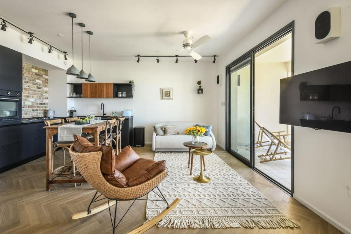 Experience serenity and luxury at Serene Studio Apartment, nestled between Tel Aviv's bustling Suzanne Dellal Center for Dance and Theatre and the vibrant Nachalat Benyamin Crafts Fair. This 1-bedroom apartment offers a spacious retreat, complete with a private balcony providing breathtaking views of the sea. Enjoy modern amenities such as an air-conditioned living area, flat-screen TV, washing machine, and fully-equipped kitchen featuring a dishwasher and oven.