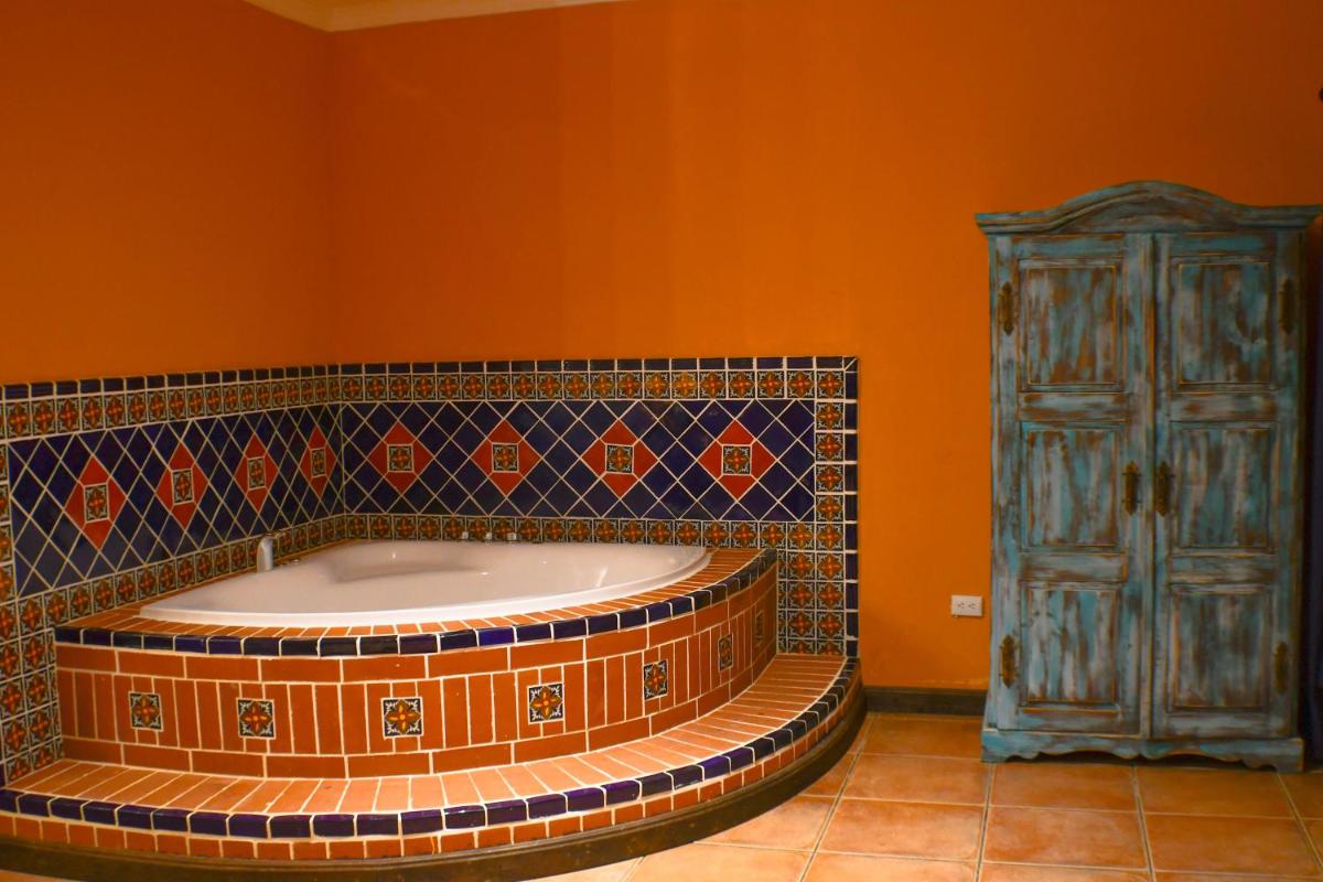 Each guest room at Hacienda San Vicente is designed with comfort in mind, featuring amenities such as desks, private bathrooms with showers and complimentary toiletries, flat-screen TVs, air conditioning, and seating areas. A selection of bed linens and towels completes the suite's luxurious appeal.
