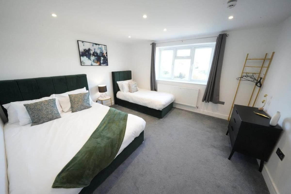 Close to Heathrow airport, electric car charging points, tea and coffee making facilities and microwave, quiet, good secure parking.