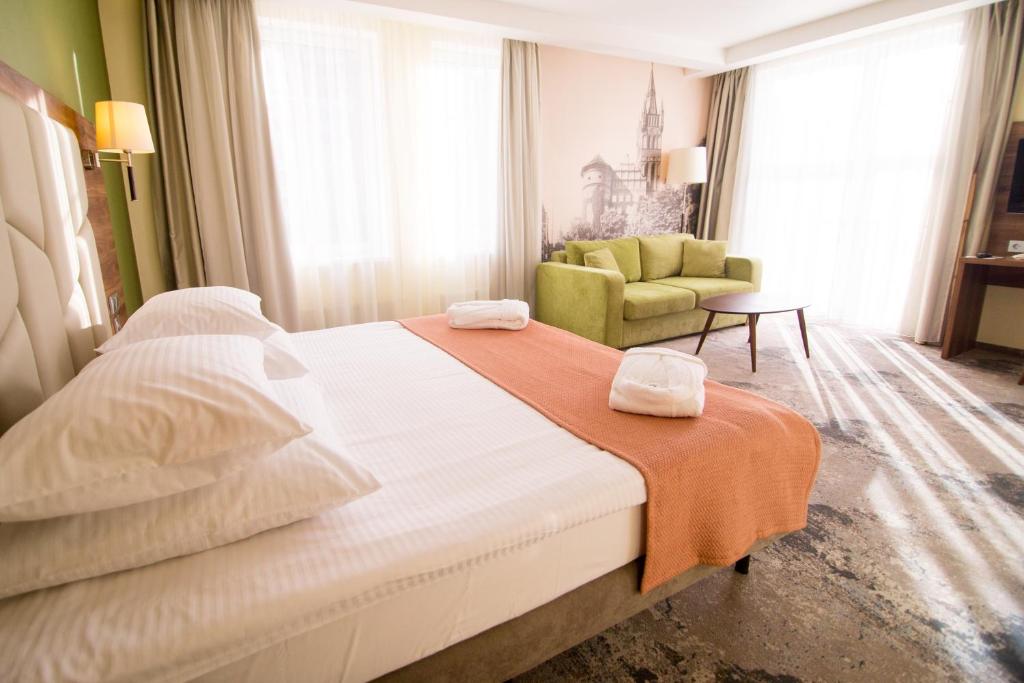 Nestled along the banks of the picturesque Pregolia River, Kaiserhof Hotel stands as an elegant retreat offering luxurious accommodations. This boutique hotel boasts spacious guest rooms and suites, each equipped with plush beds, flat-screen TVs, and balconies offering breathtaking views of either the serene river or the majestic cathedral. Guests can unwind in the spa center, which includes a stylish outdoor pool, a pool bar, and a sun terrace, complemented by five steam baths and a hot tub.