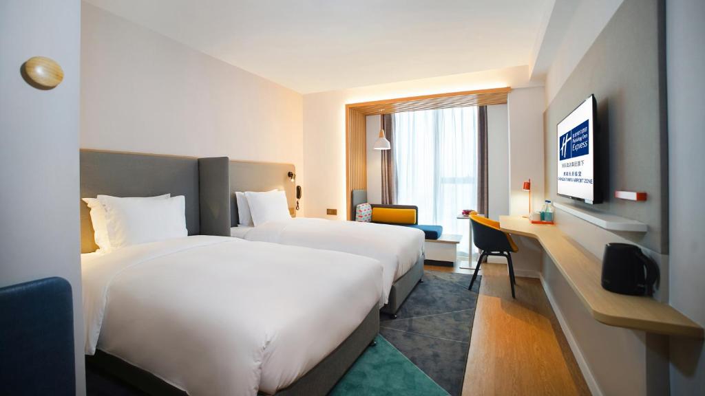 Holiday Inn Express Chengdu Tianfu Airport Zone, located in Jianyang, offers adults-only accommodations featuring a state-of-the-art fitness center and a communal lounge. This luxurious hotel boasts complimentary airport shuttles, room service, and personalized tour assistance for guests. Guests enjoy access to amenities such as a fully-equipped kitchenette, free Wi-Fi, and a spacious balcony.