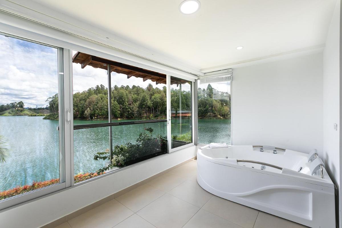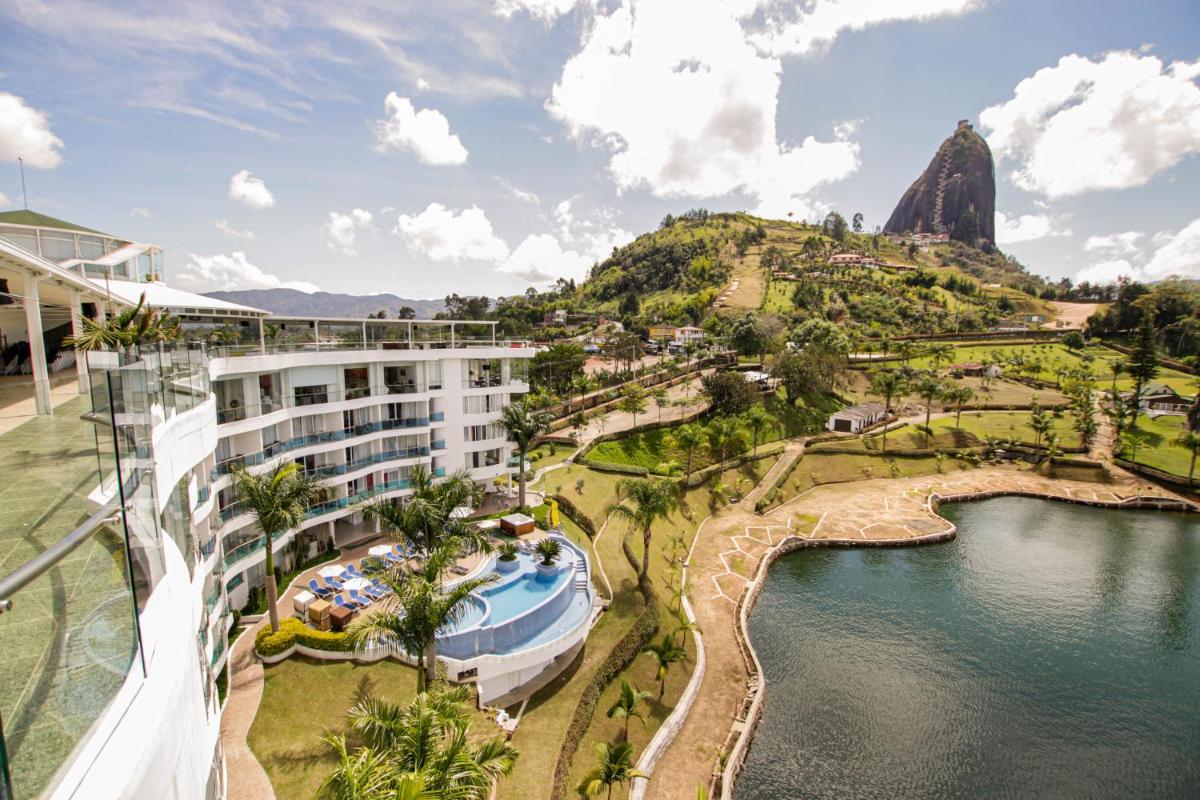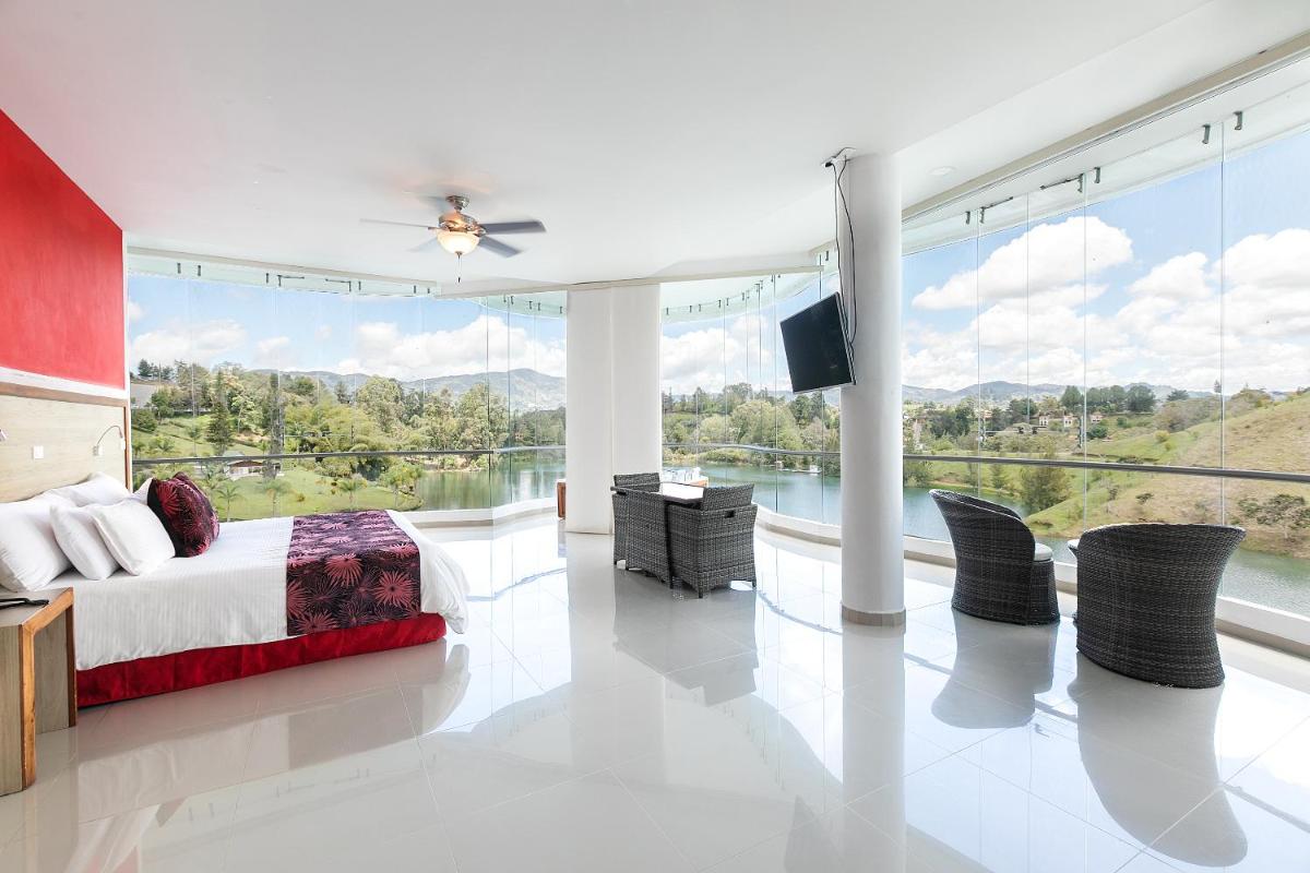 The luxurious hotel Los Recuerdos offers guests an unparalleled experience amidst Guatapá's scenic beauty. Situated just beyond the imposing El Peñol Reservoir, the establishment boasts a grand outdoor heated swimming pool with complimentary bar services, an expansive gym facility, and a serene Turkish bath. Enjoy panoramic views from the property as you swim, exercise, or relax in these inviting spaces. Free WiFi ensures connectivity throughout your stay.