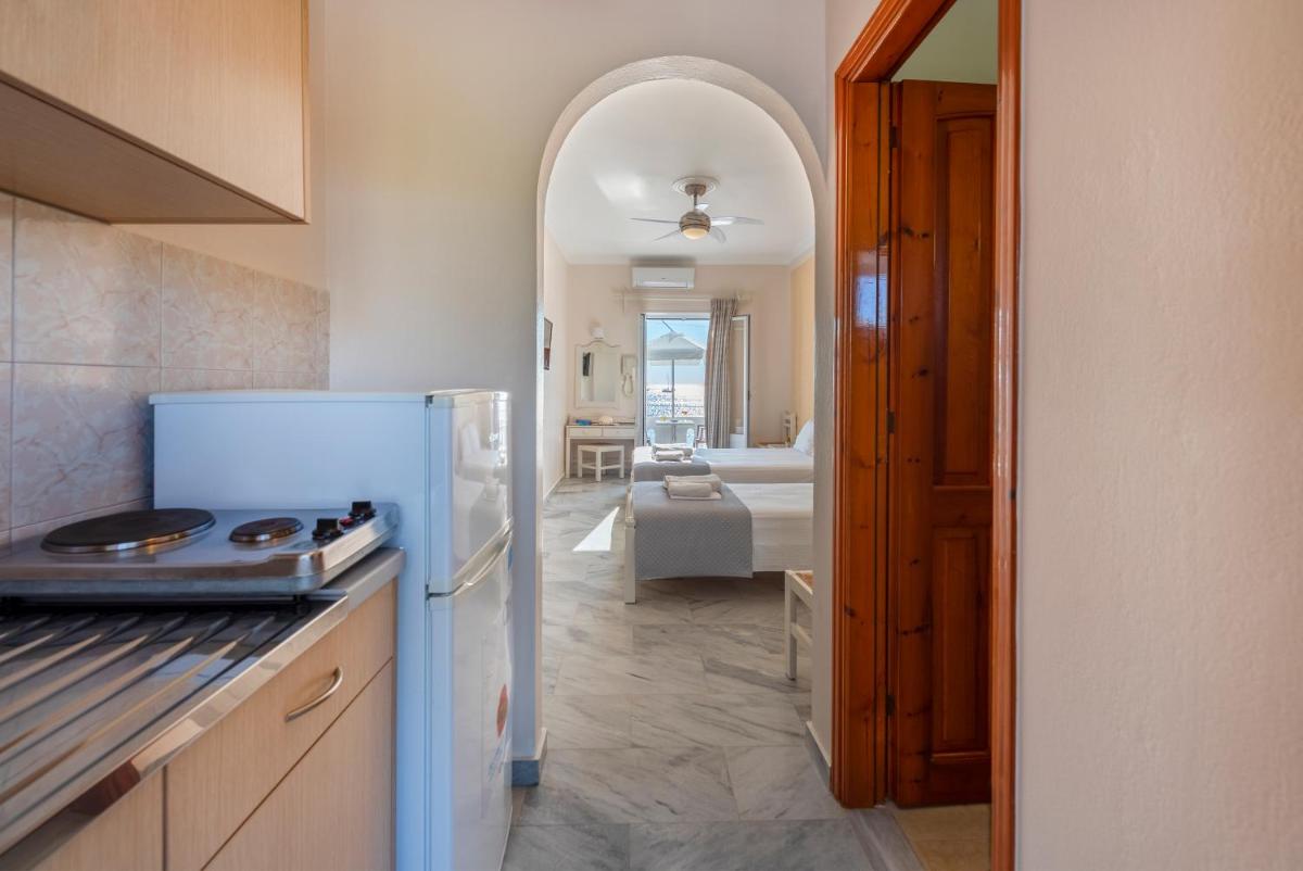 Irene Hotel – Beachfront, situated along Parikia Bay, offers a picturesque setting just 1.6 miles away from the bustling heart of town. This charming family-run establishment features beautifully designed studios equipped with balconies, ensuring every guest enjoys panoramic views of either the sea or the lush gardens beyond. Each room is fully self-contained, featuring modern amenities such as air conditioning, a well-stocked kitchenette with a refrigerator and flat-screen satellite television.