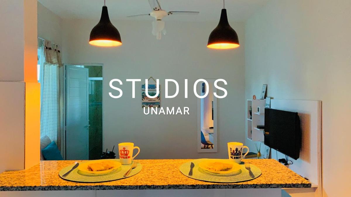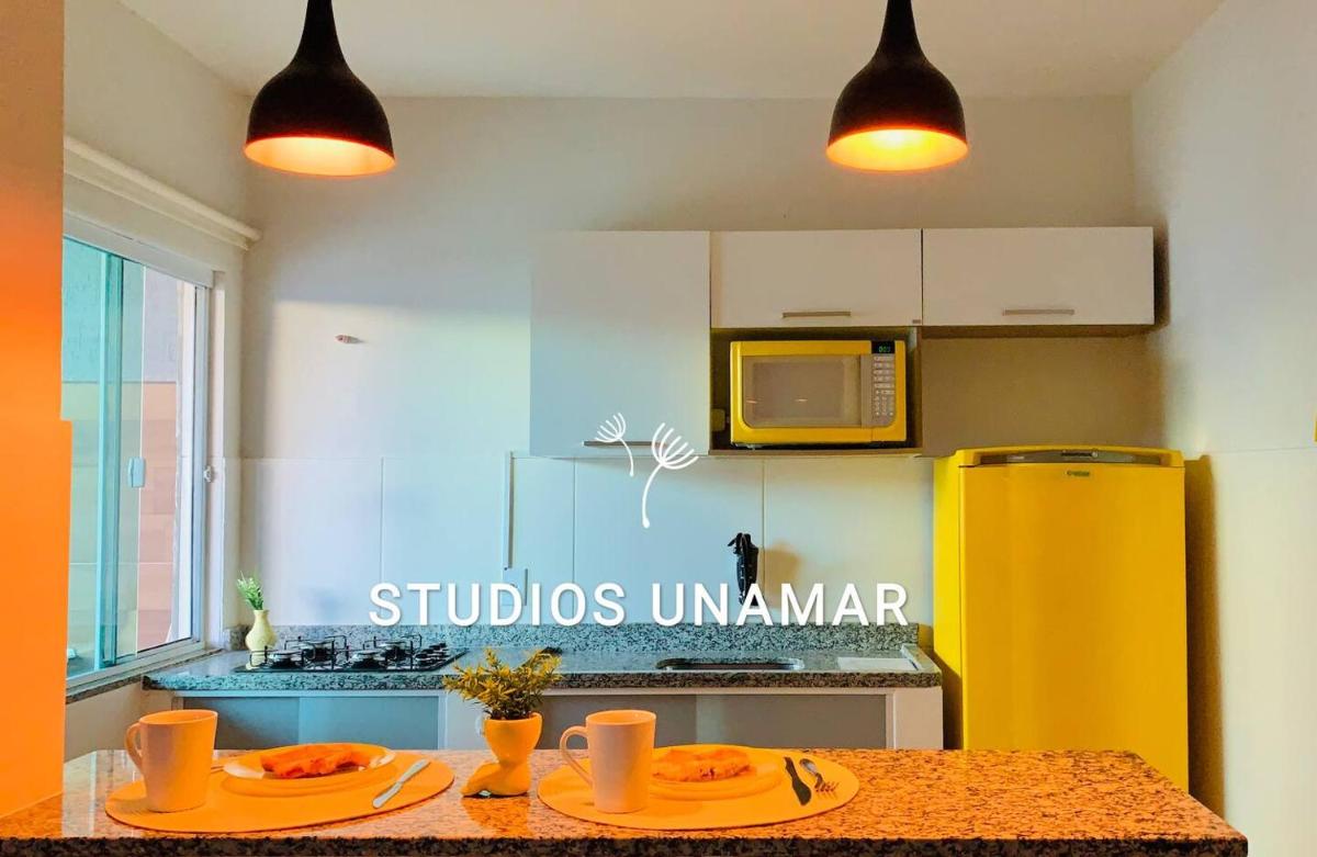 Studio Unamar offers free Wi-Fi, on-site parking, non-smoking rooms, air conditioning, an apartment layout with a fully-equipped kitchenette, a flat-screen TV with streaming options, an indoor courtyard view from each unit's balcony, and a private bathroom with a shower.