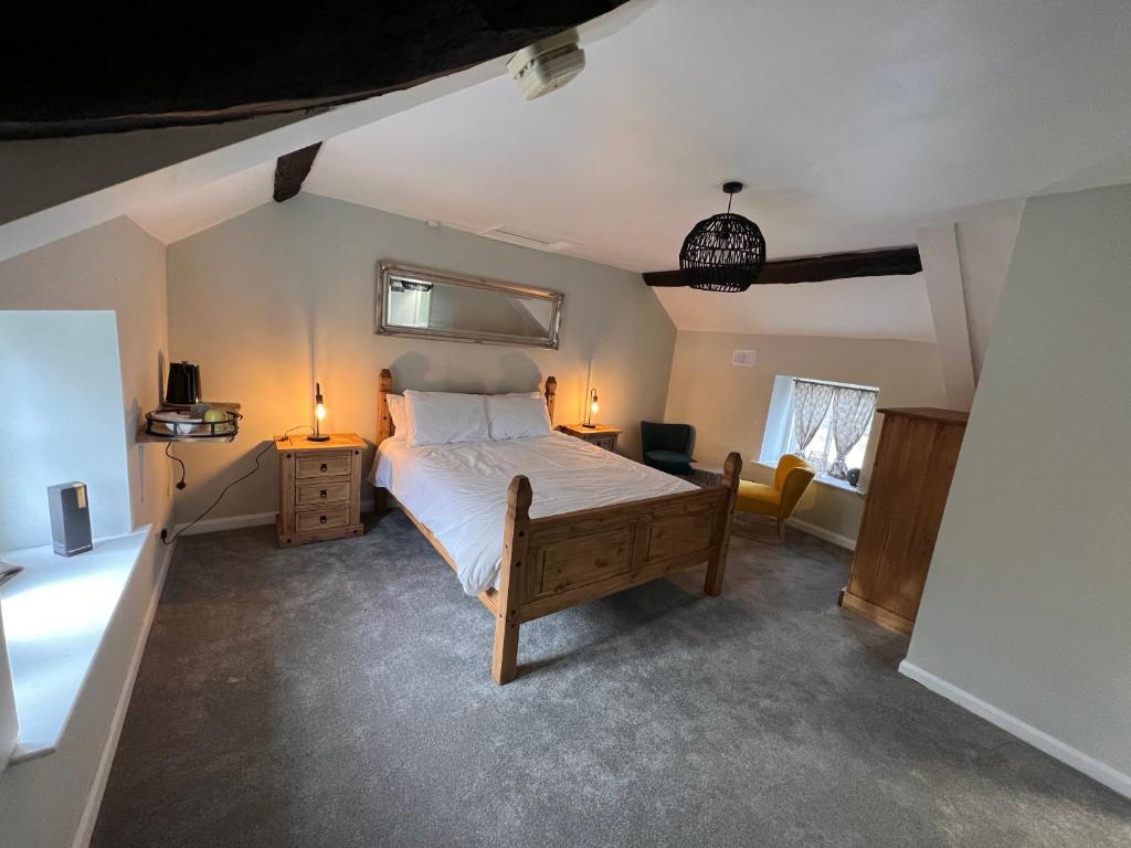 Room has beamed ceilings and lovely views - an orchard at the back, and sheep at the front.