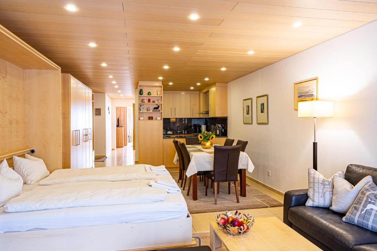 For convenience, the Laax Rancho Family Apartment offers a range of recreational services including an indoor pool, public baths, and even a ski pass sales point. The property is conveniently situated near various points of interest, with Lake Cauma being approximately 2.2 miles away, and Viamala Canyon around 21 miles further.
