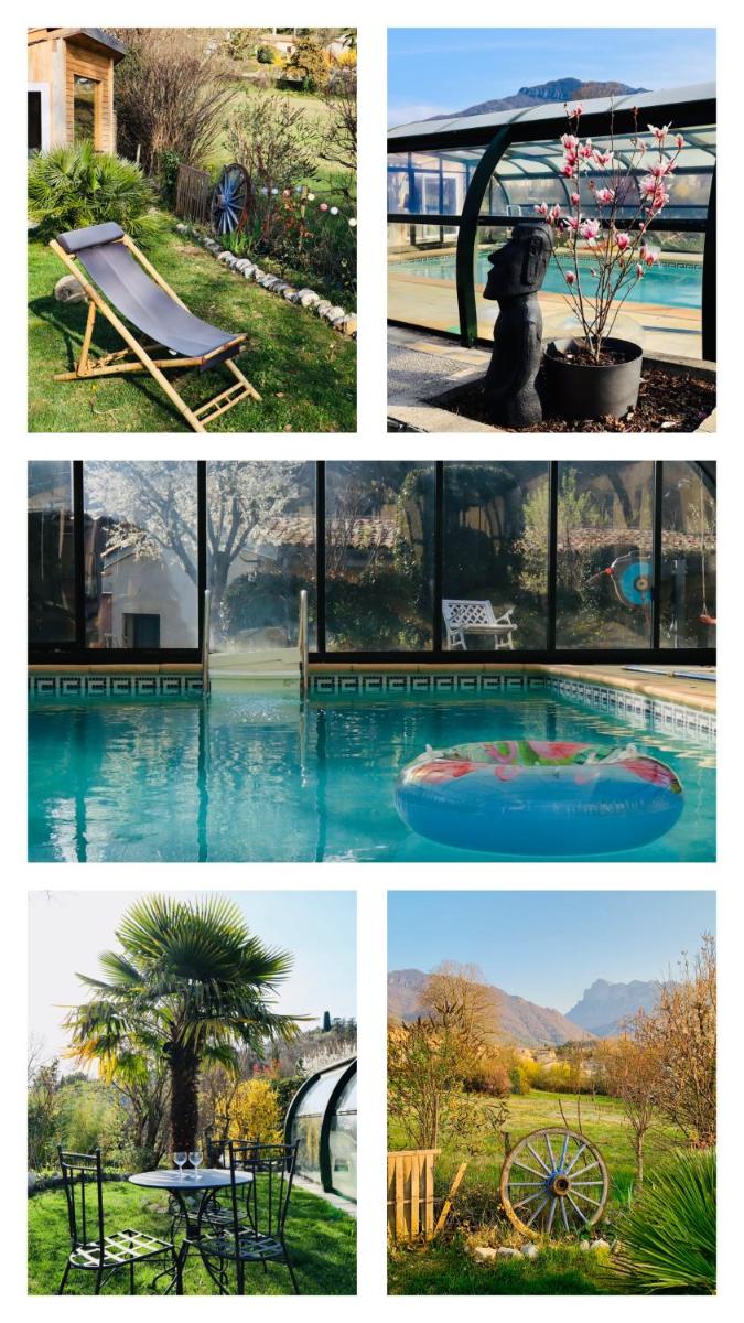 Chambre familiale "Le Pêcher," situated approximately 28 kilometers north of Valence Parc Expo in Saillans, offers a charming family-friendly accommodation offering various wellness packages. Accessible via a scenic terrace, guests enjoy complimentary private parking and unrestricted Wi-Fi. The property's spacious setting includes a pool with panoramic mountain views, spa facilities, and a communal kitchen where meals can be prepared together.