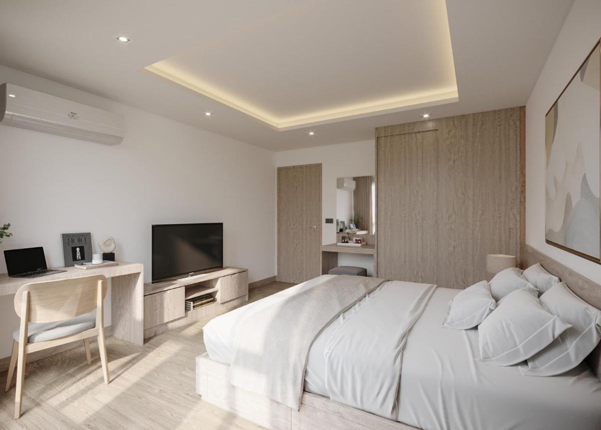 Each unit boasts a private balcony, offering breathtaking views of the surrounding landscape. Air conditioning keeps interiors cool and comfortable during hot days, ensuring a pleasant living environment. Flat-screen TVs provide entertainment options, while sleek bathrooms feature modern fixtures such as showers equipped with slippers, creating a spa-like experience.