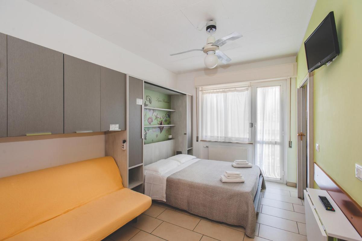 Each studio at Ligure Residence is equipped with state-of-the-art amenities, including air conditioning, TVs, and private balconies. These compact yet comfortable units come complete with a cozy seating area equipped with a double sofa bed, a fully furnished kitchenette, and a modern bathroom.
