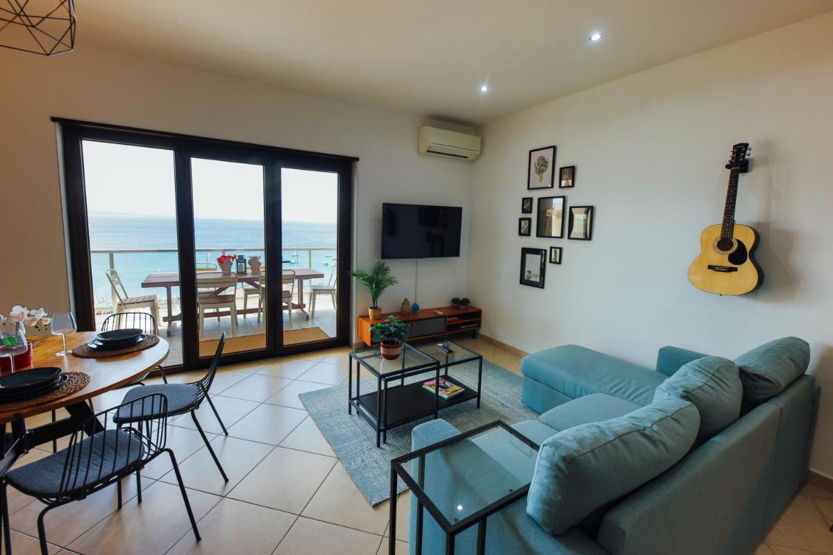 Additional perks include a flat-screen television, providing entertainment options during downtime. On the upper level, a balcony with an outdoor dining area and panoramic city views promises pleasant evenings spent outdoors. The apartment's central location makes it ideal for those seeking relaxation along the coast or engaging in various water sports like snorkeling and cycling.