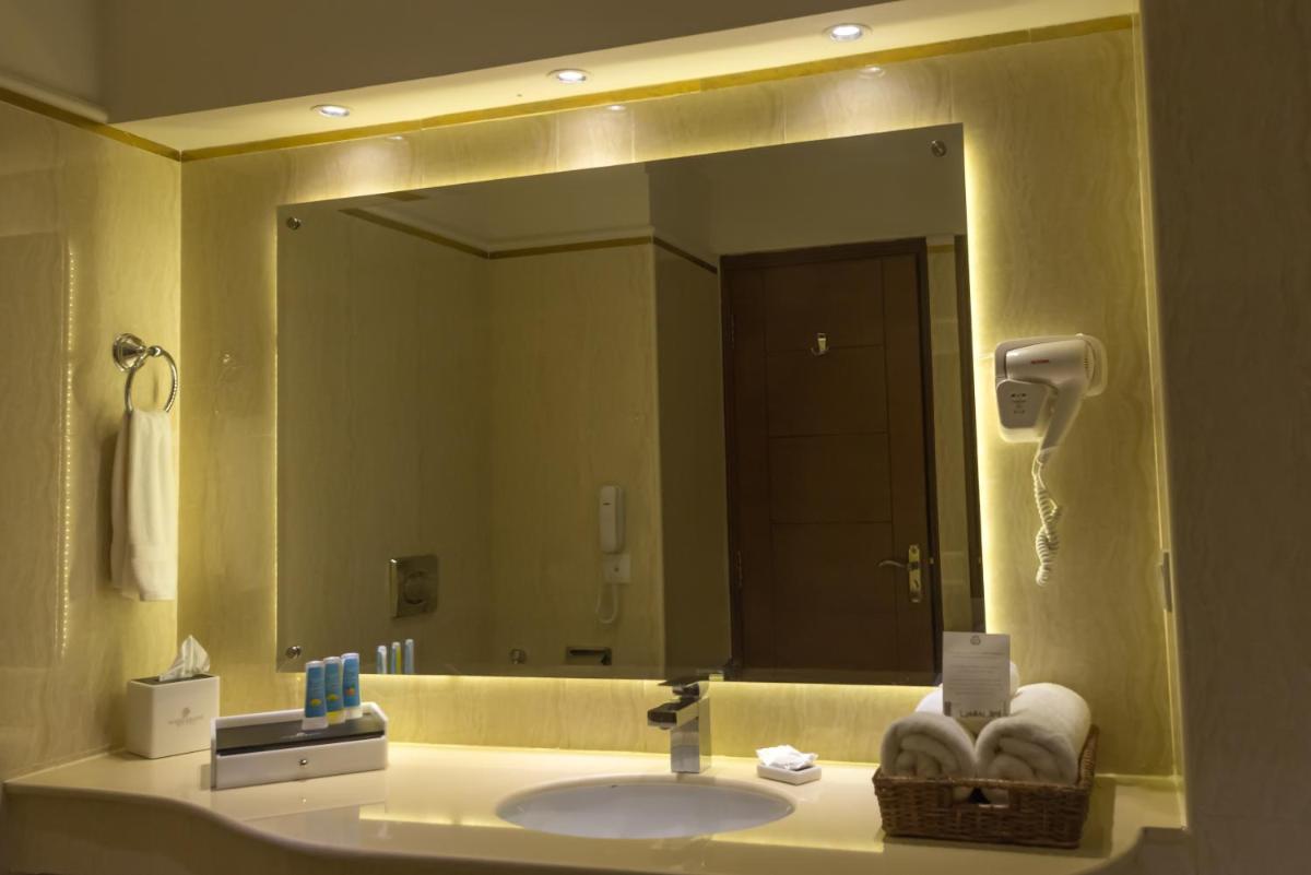 Rooms at Luxus Grand Hotel feature spacious bathrooms complete with bathrobes, soft towels, slippers, and free toiletries and amenities. Each suite includes a small fruit basket and complimentary mineral water bottles, enhancing the guest experience.