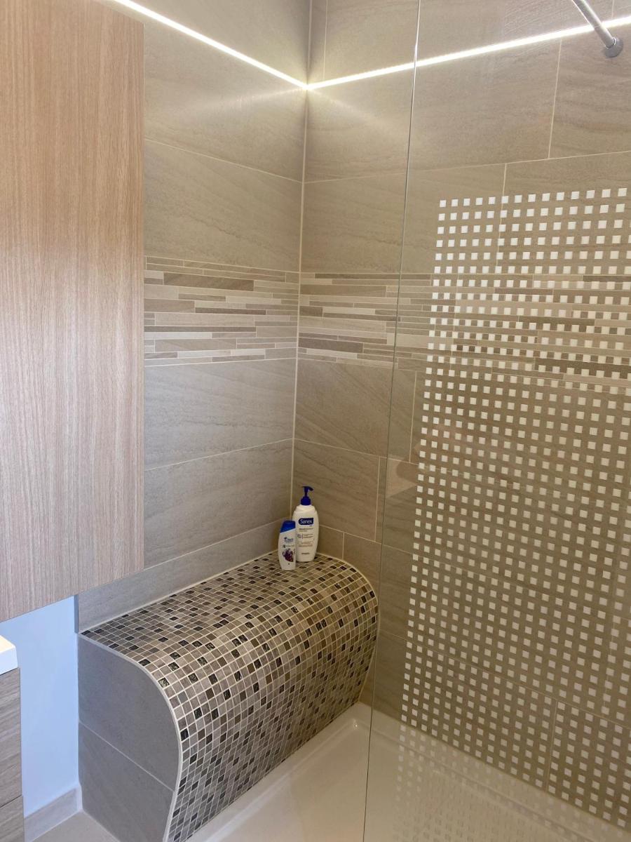 The tiled bathroom was classy and spacious.