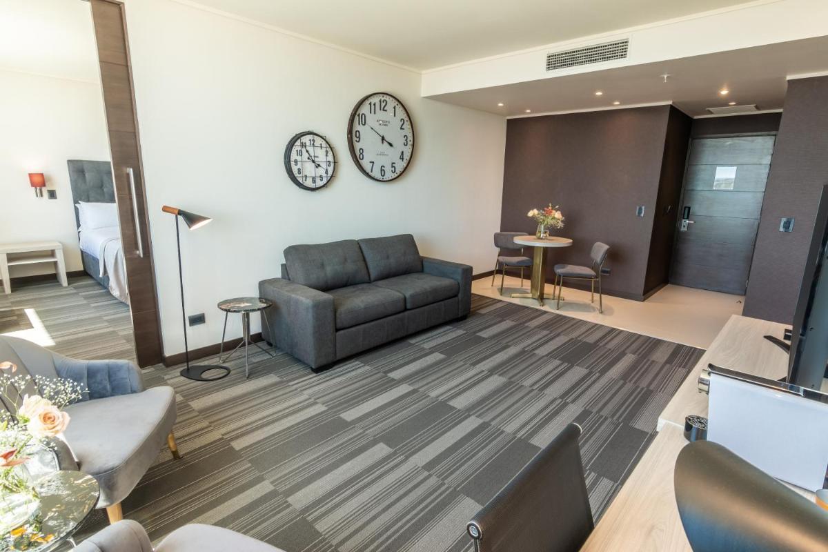 Each accommodation includes a spacious bedroom equipped with a flat-screen television, a comfortable work station, and a coffee machine. Air conditioning ensures comfort during warm days, and private bathrooms offer luxury amenities such as showers and hairdryers. The wellness area at MDS Hotel Chillan caters to diverse needs, offering a state-of-the-art gym, steam and sauna facilities, and relaxation zones designed for both mind and body.