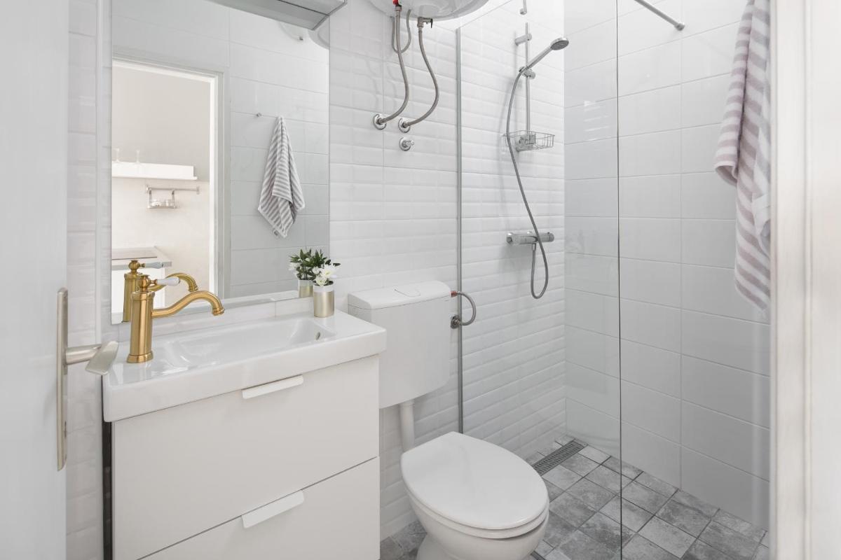 A comfortable bedroom awaits within the apartment, featuring a tastefully designed en-suite bathroom complete with a walk-in shower and a hairdryer, making mornings more pleasant. The space is generously sized at 25 square meters, providing ample room for relaxation and entertainment.