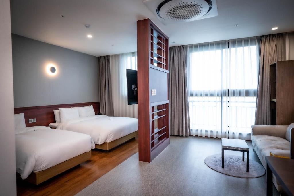 The hotel is located approximately 3.6 miles from Seomyeon Station, 4.7 miles from National Maritime Museum, and 4.8 miles from Kyungsung University. It is also near popular tourist spots such as Gwangbok-Dong, Busan Port, and Gukje Market.