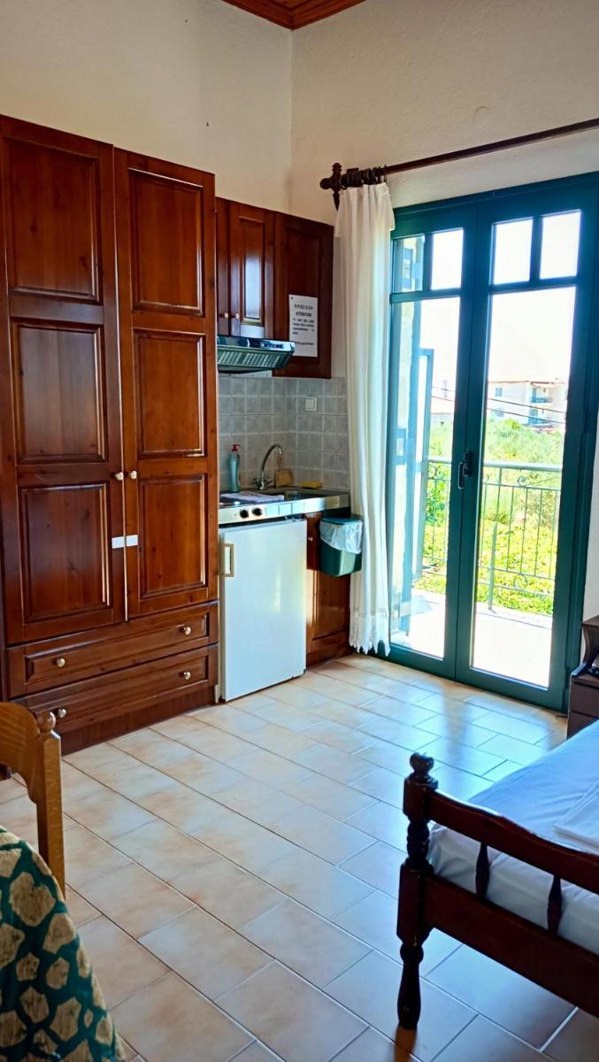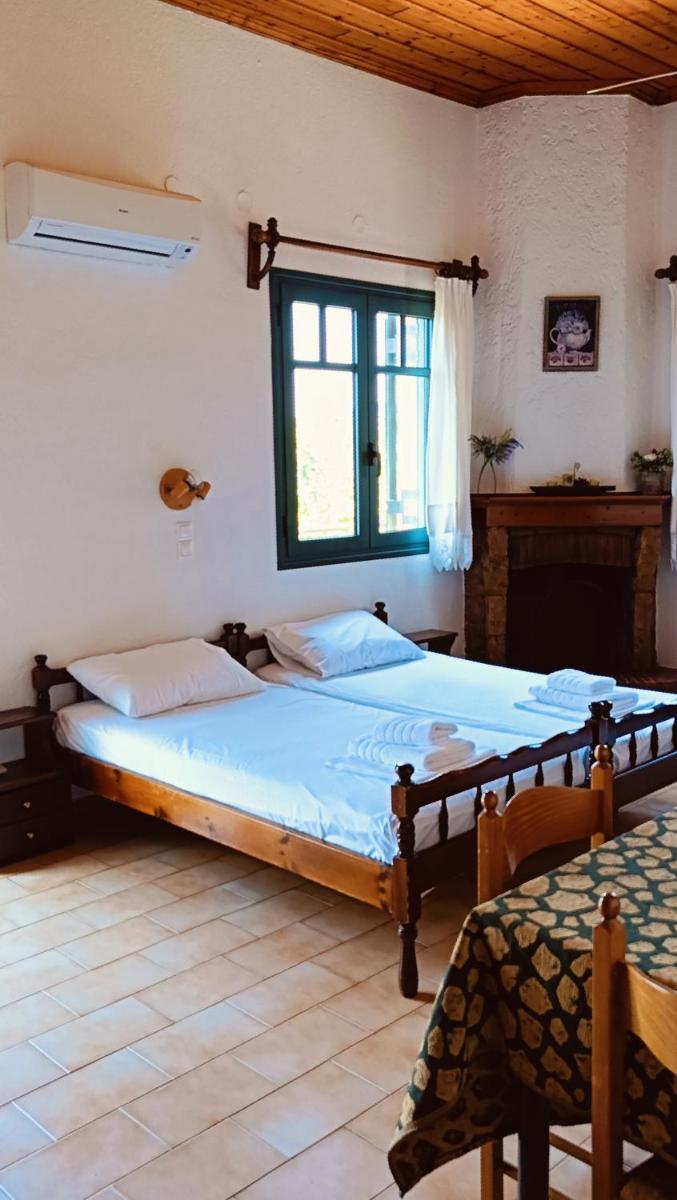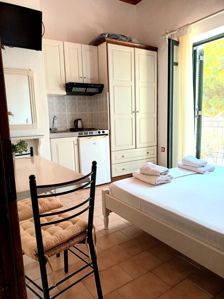 Opening to a furnished balcony, the air-conditioned studios are traditionally decorated with dark-wooden furnishings. Each features a kitchenette with fridge and cooking hobs, and a private bathroom with hairdryer. A fan and a TV with satellite channels are available, while a fireplace is also featured in some units.