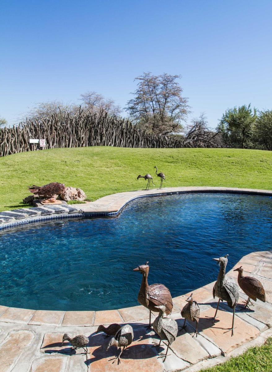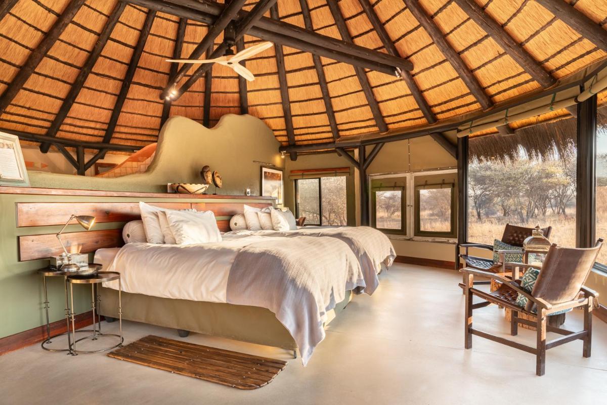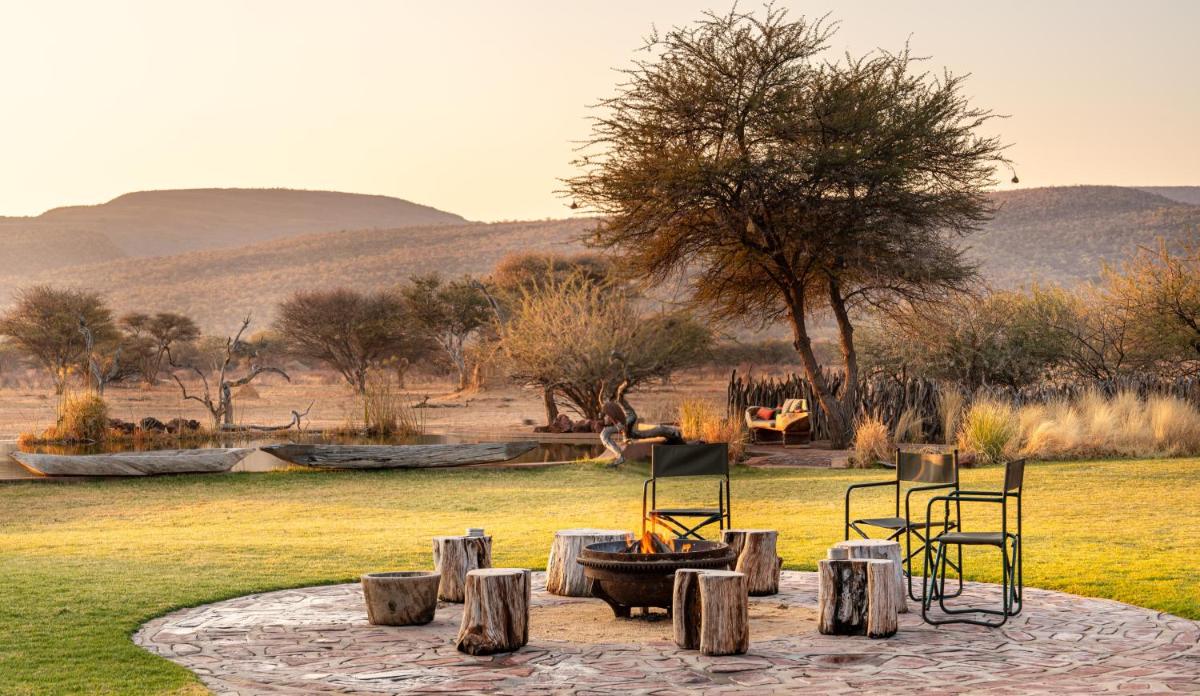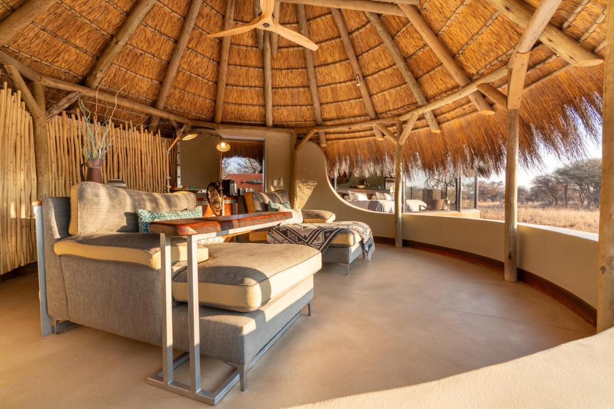 Okonjima Luxury Bush Camp, nestled in Otjiwarongo's serene nature reserve, offers luxurious accommodation with complimentary private parking and free Wi-Fi. Each chalet features an open pavilion named "Sala," equipped with a mini-bar and seating area. Guests enjoy a continental breakfast daily and access an outdoor pool. Ideal for couples, this camp rates highly at 10.0 out of 5 for a two-person trip. Located 14 miles from the B1 highway, it's conveniently situated near Ombu Museum and other nearby attractions.