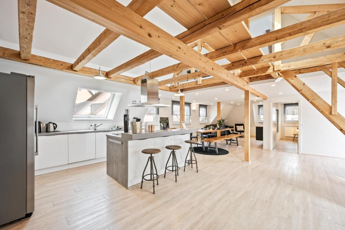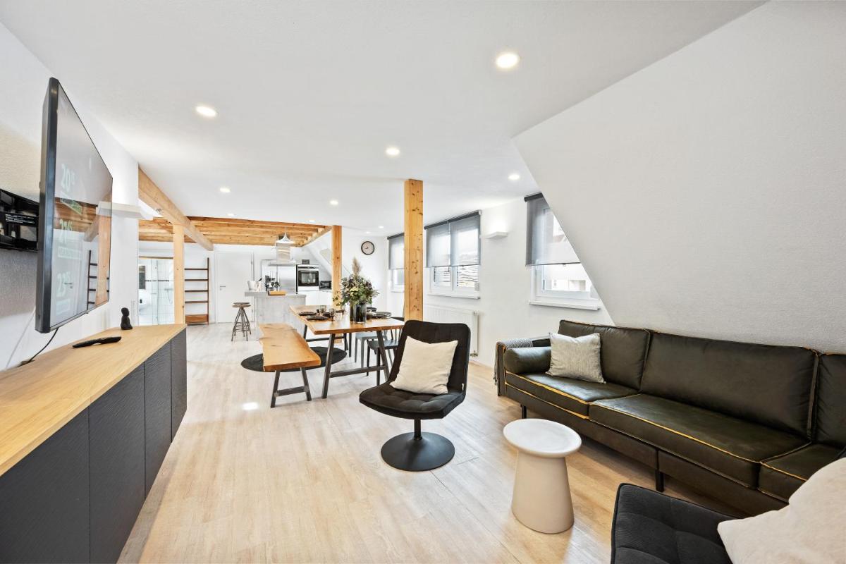 Sali Homes-Penthouse offers luxurious penthouse accommodations nestled within Obersulm, boasting breathtaking inner courtyard views. This prime location allows residents to enjoy serene outdoor spaces with plush patios, perfect for relaxation and leisure. Guests will find an inviting outdoor fireplace, making it ideal for social gatherings and cozy evenings by the fire.