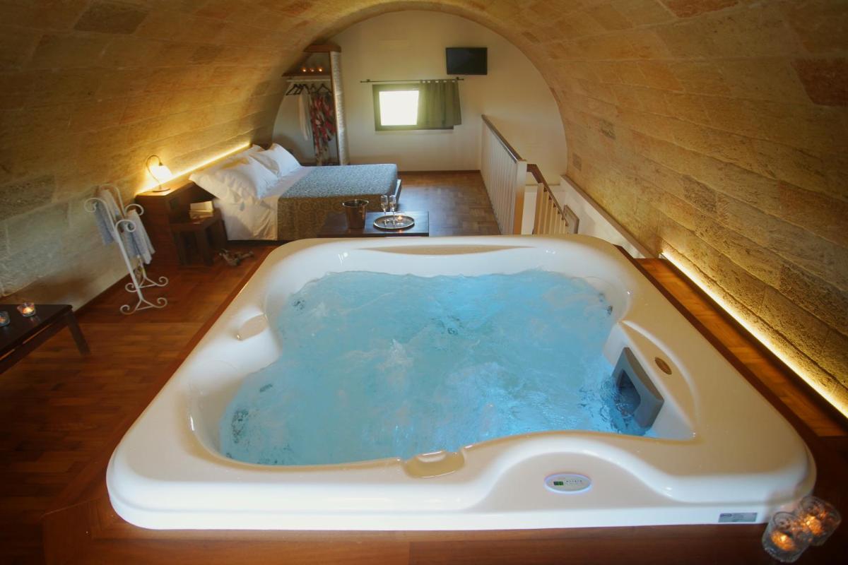 Relais L'Oliveto in Surano offers a charming retreat nestled among lush gardens, offering panoramic views that enhance its allure. Guests can look forward to luxurious amenities such as an infinity pool, an outdoor hot tub, and complimentary Wi-Fi throughout their stay. The spacious accommodations feature modern conveniences including an open-air bathtub, a fully-equipped kitchen, and ample living space.