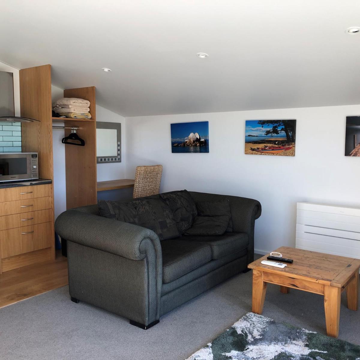 Located in Nelson, Ruby Bay Loft Accommodation is a charming rental offering guests a peaceful retreat with stunning ocean views. Situated approximately 20 miles from Christ Church Cathedral and 21 miles from Trafalgar Park, this property boasts a comfortable one-bedroom apartment featuring amenities such as a fully equipped kitchenette with essential appliances like a microwave and kettle. The apartment's open-plan layout invites guests to enjoy meals together, while the spacious balcony provides breathtaking vistas of the sea. A private bathroom with a bathtub or shower and hairdryer ensures convenience, complementing the cozy atmosphere.
